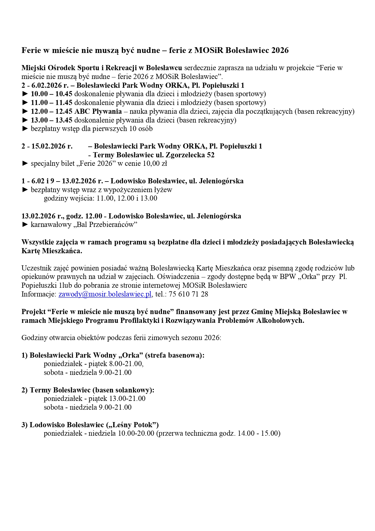 Informujemy, że udział w zajęciach jest bezpłatny wyłącznie dla dzieci i młodzieży posiadających ważną Bolesławiecką Kartę Mieszkańca (BKM). W przypadku braku karty obowiązuje odpłatność zgodnie z cennikiem określonym w regulaminie ferii zimowych.