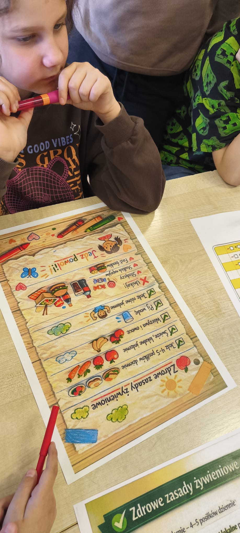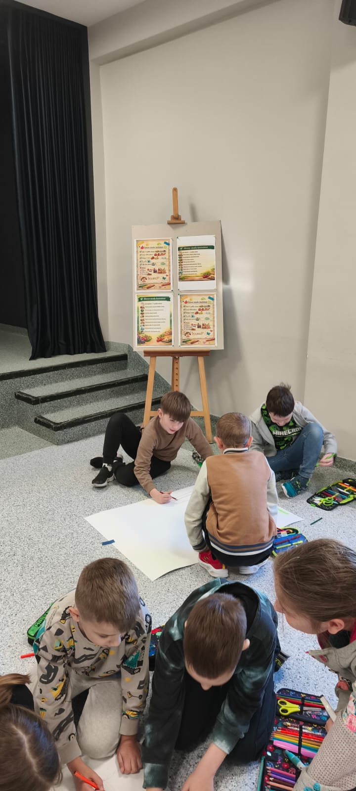 Uczniowie dowiedzieli się, dlaczego warto wybierać produkty świeże, lokalne i jak najmniej przetworzone. Dzieci rozmawiały o swoich codziennych wyborach żywieniowych, zastanawiały się nad ich wpływem na zdrowie i środowisko oraz dzieliły się zdobytą wiedzą z innymi. Jednym z elementów projektu było przygotowanie materiałów i informacji dla rodziców, które zachęcały do wspólnego dbania o zdrową dietę w domu.
