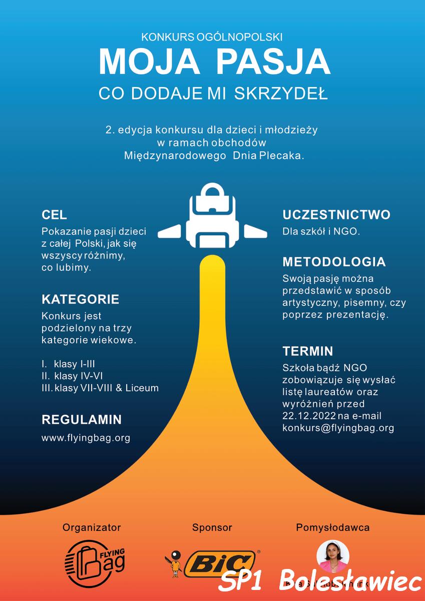 Sponsorem konkursu, którego celem jest prezentacja pasji uczniów szkół podstawowych i średnich jest BIC Polska. Uczestnicy, podzieleni zostali na trzy kategorie wiekowe: grupa najmłodsza, kl. 1-3, miała za zadanie wykonać pracę plastyczną (rozmiar i technika prac nie zostały narzucone), średnia grupa, kl. 4-6, miała do wyboru pracę plastyczną lub prezentację w dowolnym programie oraz najstarsza grupa, uczniowie kl. 7-8 SP i szkół ponadpodstawowych, których zadaniem było opisanie swojej pasji w jak najciekawszy sposób.