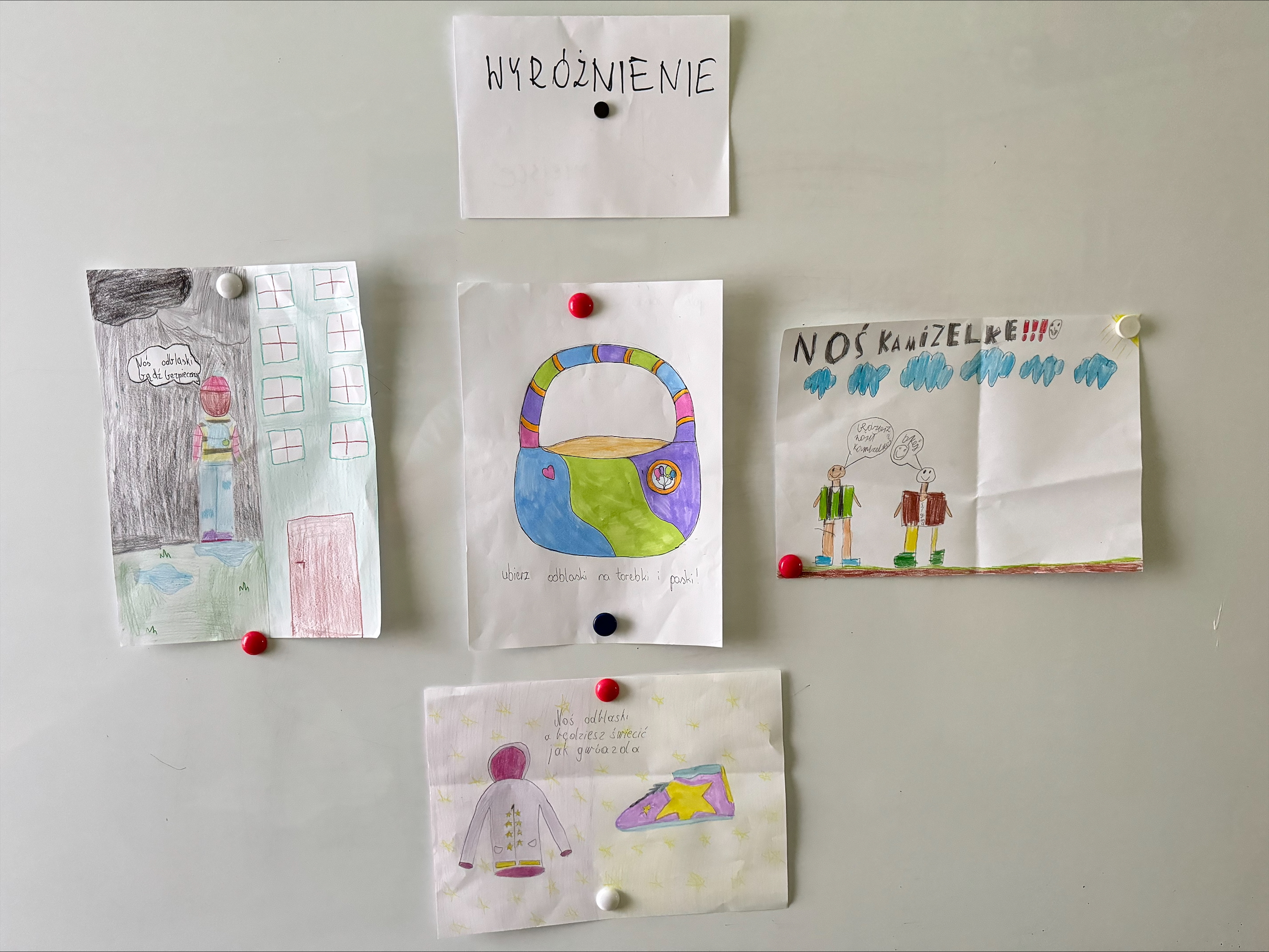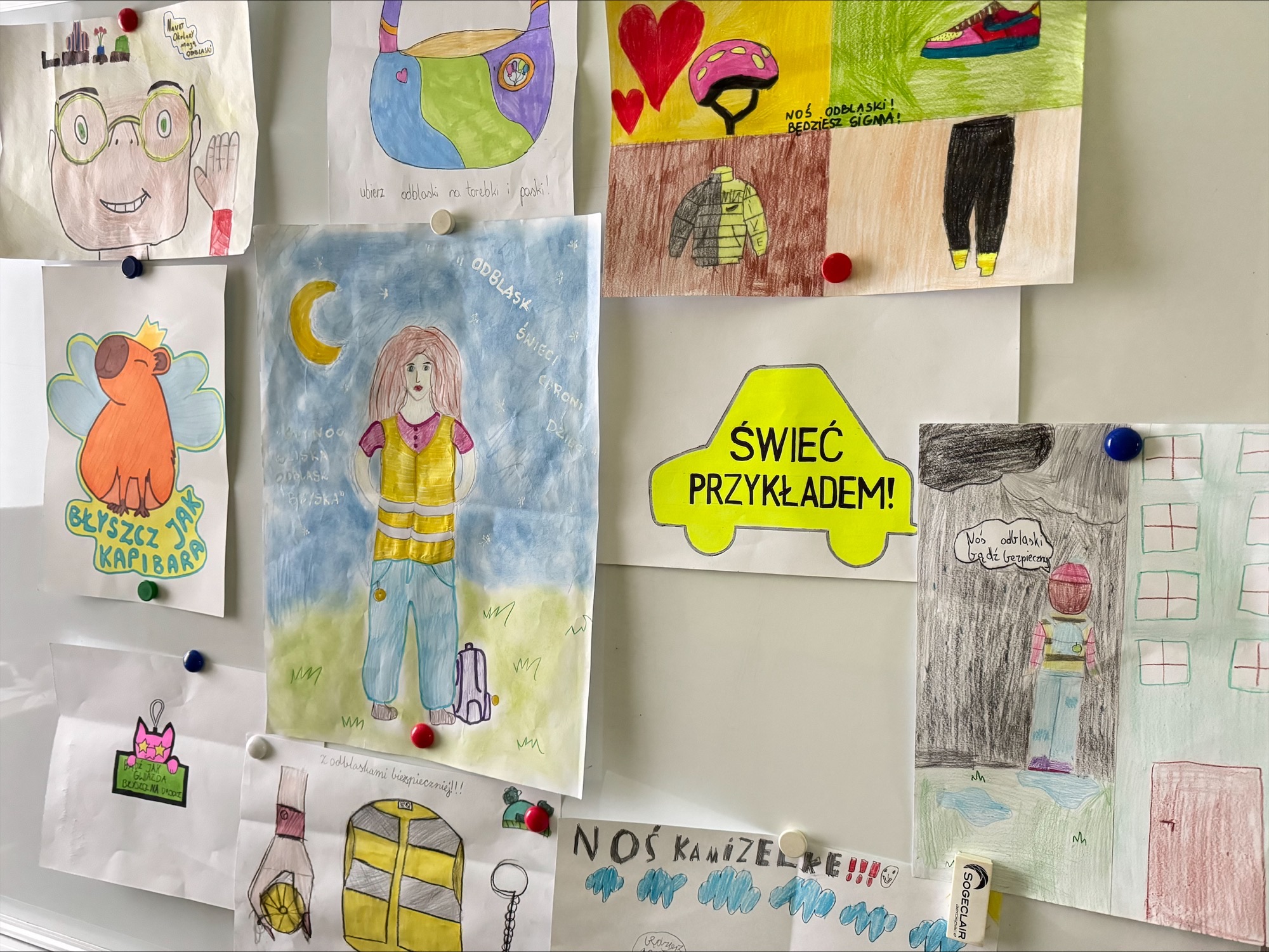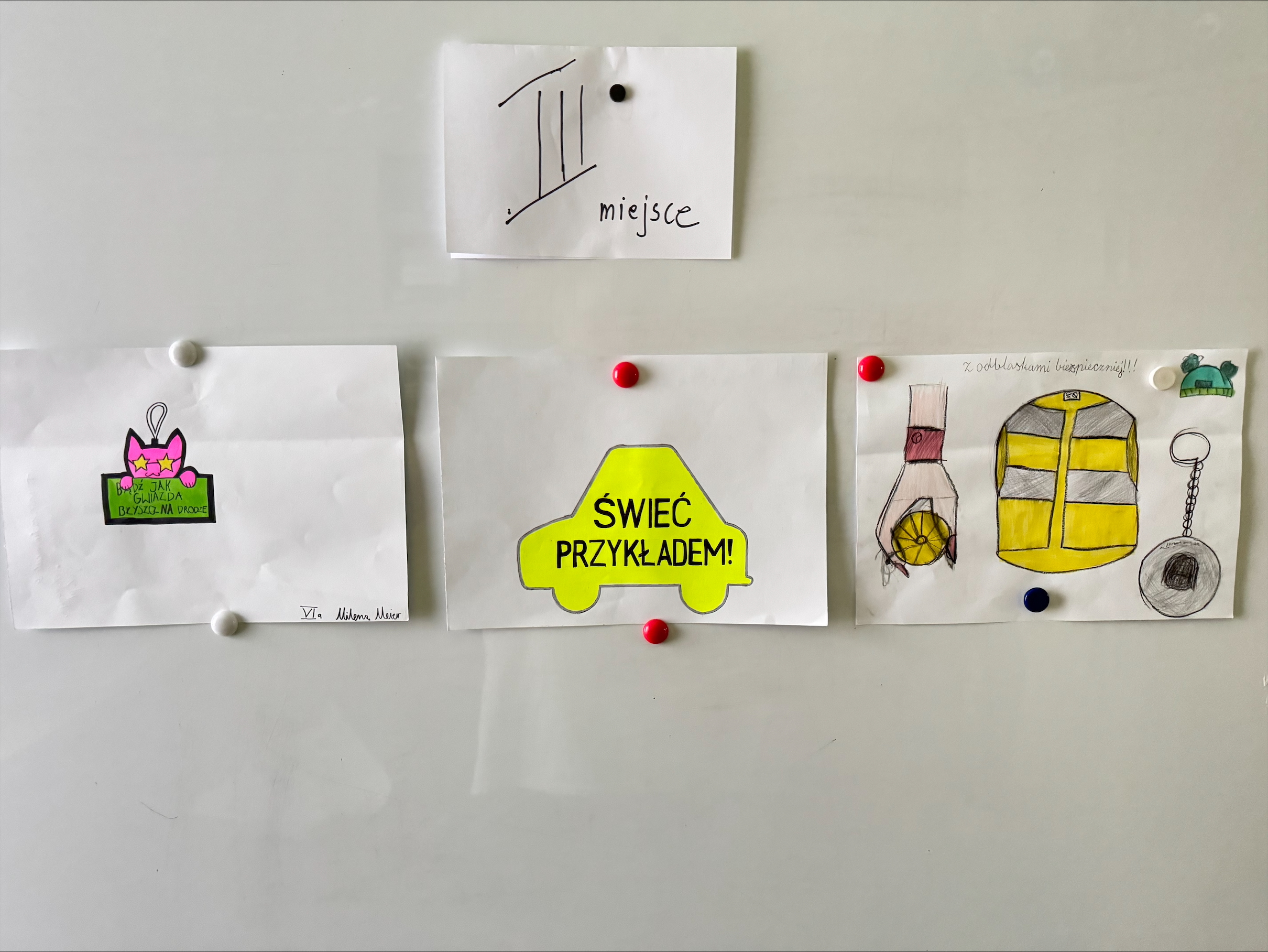 Uczniowie z klas 4–6 mieli za zadanie zaprojektować oryginalny element odblaskowy wraz z hasłem zachęcającym do jego noszenia.