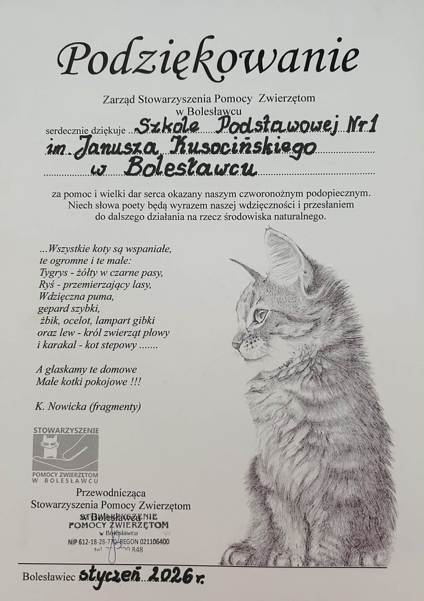 W styczniu 2026 roku nasi uczniowie wraz z rodzicami wzięli udział w akcji na rzecz bolesławieckich kociaków. Dzięki ich ogromnemu sercu i zaangażowaniu, podopieczni czworonożni otrzymali potrzebną pomoc, a przede wszystkim poczuli miłość i troskę.