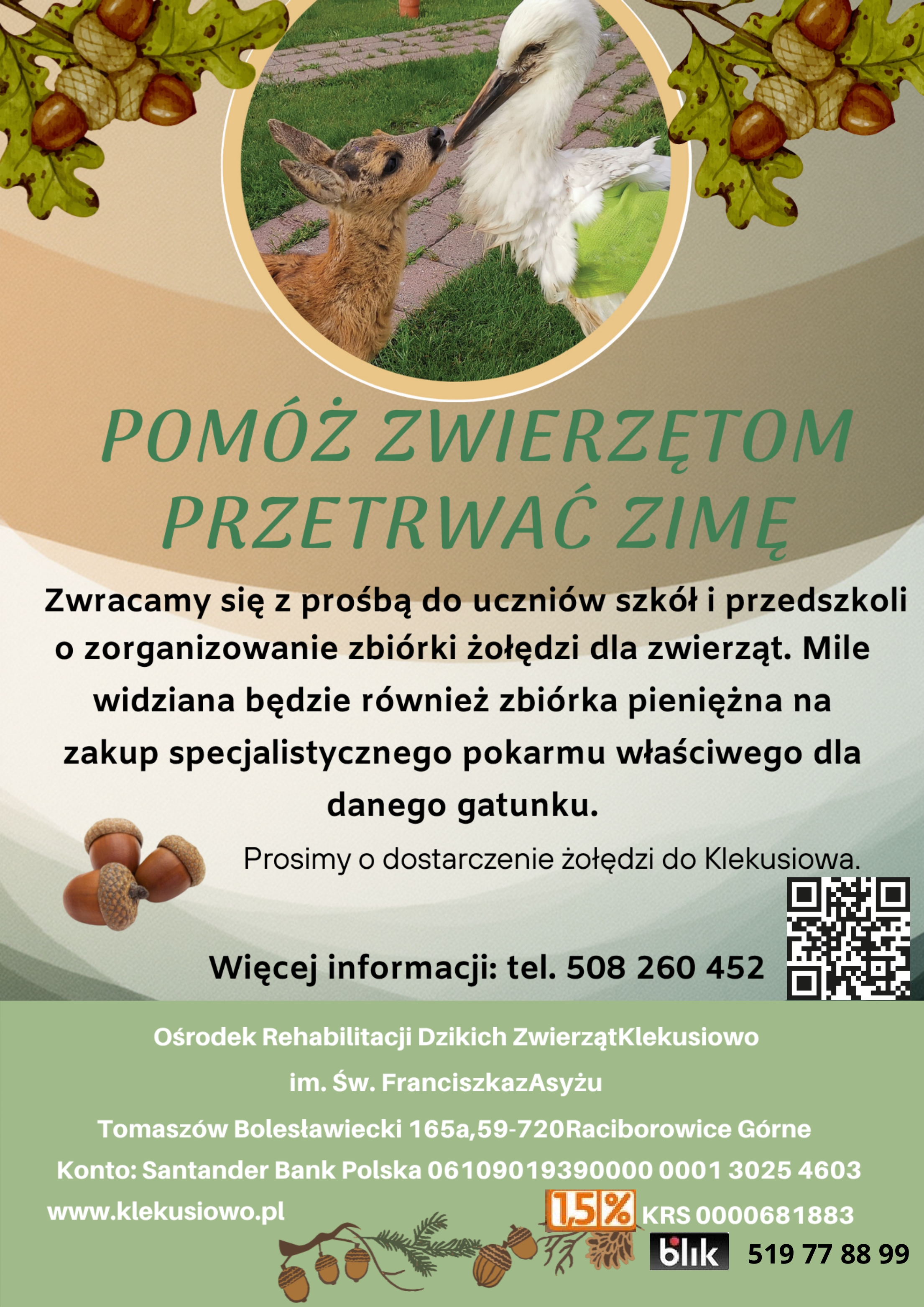 Składamy najgorętsze podziękowania wszystkim Rodzicom oraz Uczniom, którzy z zaangażowaniem włączyli się w zbiórkę karmy dla Klekusiowa. Dzięki Waszej życzliwości, wrażliwości i chęci niesienia pomocy udało się zgromadzić znaczną ilość żołędzi, która trafi do potrzebujących zwierząt. Wasza postawa jest pięknym przykładem solidarności i empatii. Dziękujemy za każdy gest wsparcia, zaangażowanie i otwarte serca.